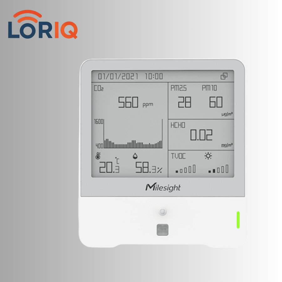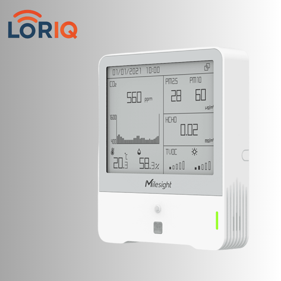 De AM319 HCHO is een hoogwaardige LoRaWAN-sensor die de luchtkwaliteit binnenshuis monitort op onder andere CO₂, fijnstof (PM) en formaldehyde (HCHO). Op het grote E-ink display zijn meetwaarden realtime af te lezen — ideaal voor omgevingen waar luchtkwaliteit essentieel is.